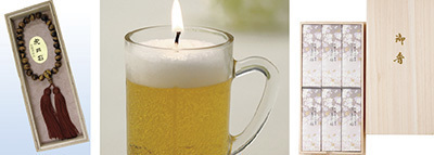 右の「念珠」「ローソク」「線香」も各種取り扱いしております。